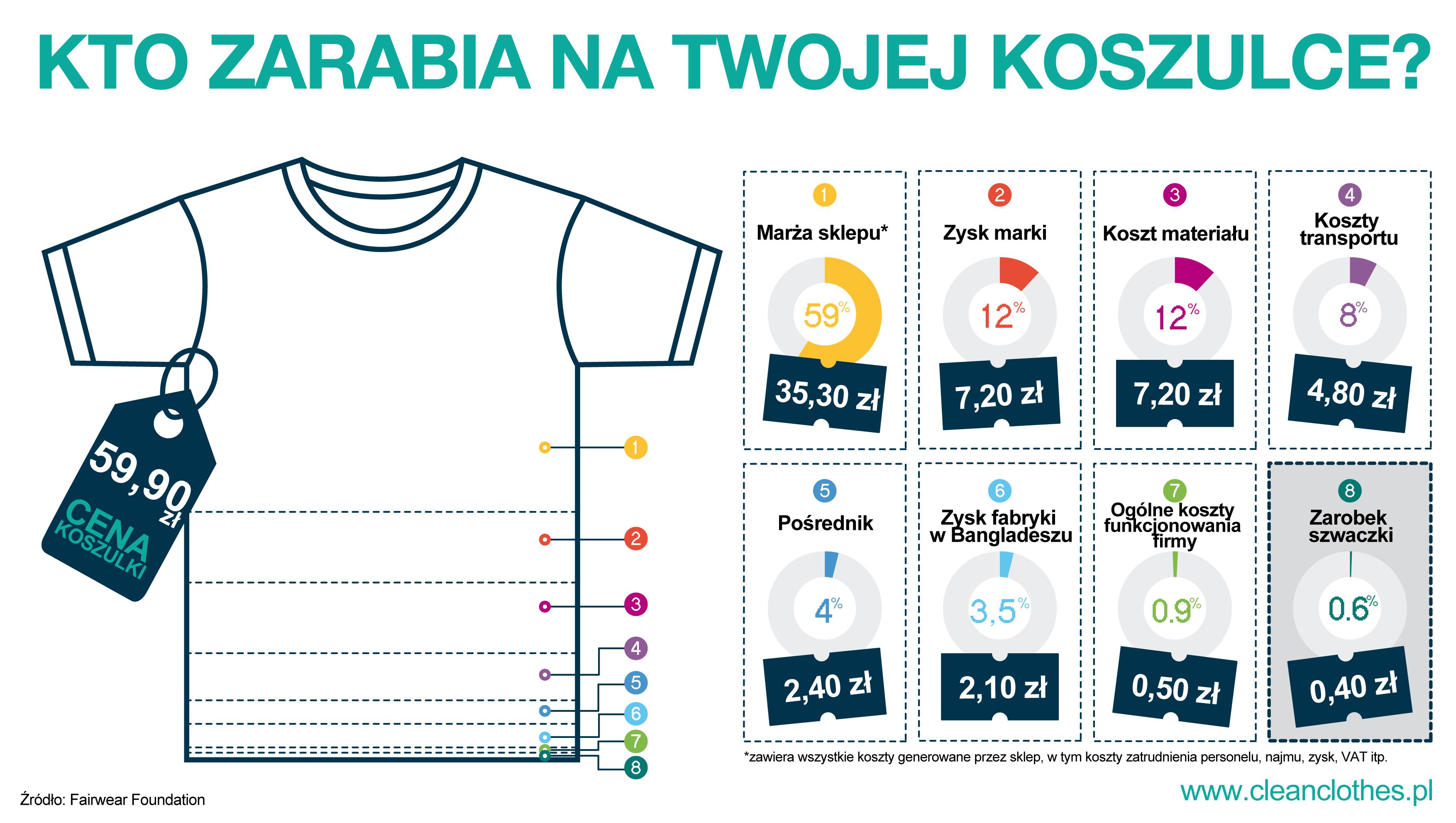 Kto zarabia na Twojej koszulce? Ilustracja demonstrująca podział zysków w łańcuchu produkcji odzieży